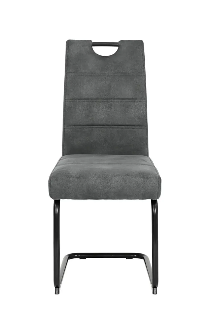 Der Stuhl besticht durch seine graue Vintage-Optik, die durch den Einsatz von hochwertigem Mikrofaser-Textil erreicht wird. Das Material besteht zu 100 % aus Polyester, was für Langlebigkeit und einfache Pflege sorgt. Das pulverbeschichtete Metallgestell in Schwarz verleiht dem Stuhl eine matte Optik und sorgt für Stabilität. Die Polsterung mit Federkern bietet zusätzlichen Sitzkomfort. Der integrierte Griff erleichtert das Umstellen des Stuhls, was besonders in dynamischen Wohnumgebungen von Vorteil ist.