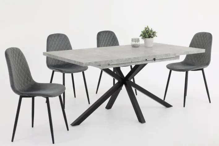 „Der Esszimmerstuhl MIRA zeigt einen grauen Korpus. Er besitzt außerdem ein Vierfußgestell. Unter dem Samtvelours ist der Stuhl gepolstert, zudem zeigt er eine Rautensteppung. Die Sitzhöhe beträgt 48 cm, die Sitztiefe liegt bei 42 cm.