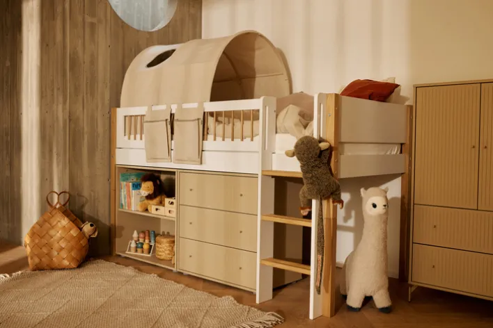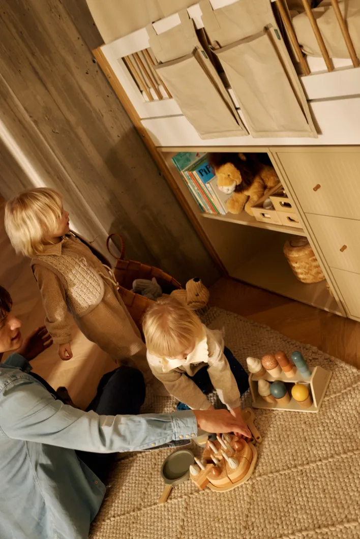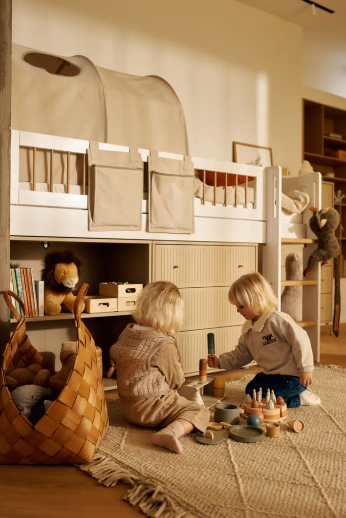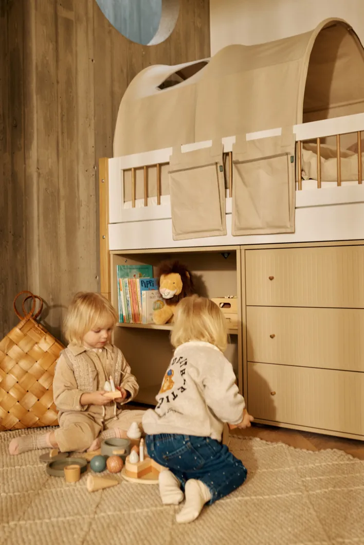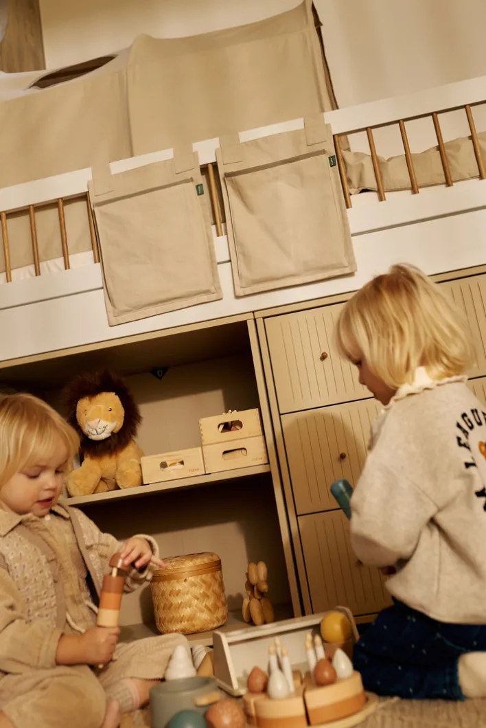 Die Taschen zeigen eine rechteckige Form mit klaren Kanten und verfügen über zwei stabile Schlaufen an der Oberseite, die eine einfache Befestigung ermöglichen. Die sichtbare Oberfläche ist einfarbig, ohne Muster oder auffällige Strukturen, und wirkt durch den textilen Charakter freundlich und zurückhaltend. Die Verarbeitung erscheint robust, sodass die Taschen für den Alltag im Kinderzimmer geeignet sind.