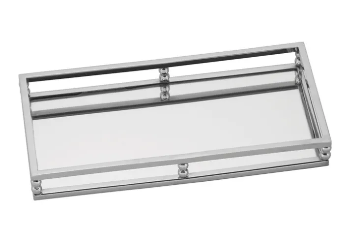 Das Dekotablett COSIMA der Qualitätsmarke Fink ist 20 cm breit, 40 cm lang und 5 cm hoch. Es ist aus silberfarbigem Edelstahl mit Spiegelglas gefertigt.