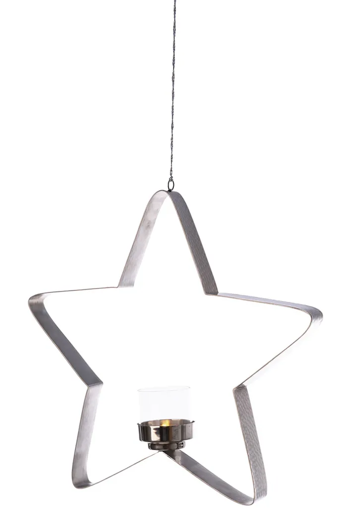 Der STACEY Teelichthalter zum Aufhängen ist 30 cm breit. Es handelt sich um einen silberfarbiger Dekoartikel für die Weihnachts- und Adventszeit.