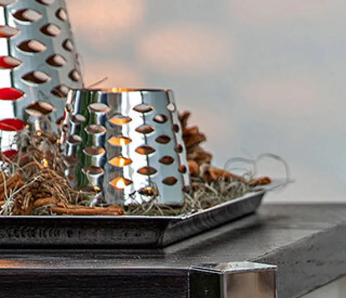 Das Fink Windlicht LUMA besitzt einen Durchmesser von 7 cm. Es besteht vollkommen aus silberfarbigem Edelstahl und zeigt eine elegante, gleichmäßige Lochstanzung.