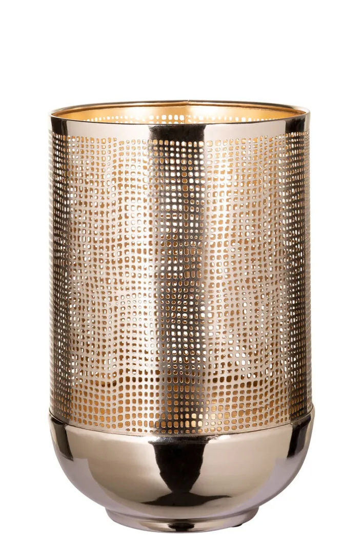 Das moderne Fink Windlicht MAURA vereint Glas und Metall. Mit der vernickelten Oberfläche, die außen in Silberfarbig gehalten ist, ist das Windlicht vielseitig kombinierbar. Die Innenseite erstrahlt in Goldfarbig, wodurch das Kerzenlicht besonders warm strahlt. Durch das schöne Lochmuster zaubert die Kerze spannende Lichtspiele an die Wände. Das edle Windlicht ist für Stumpenkerzen und Teelichter gleichermaßen geeignet und sieht auch auf der Terrasse wunderschön aus.