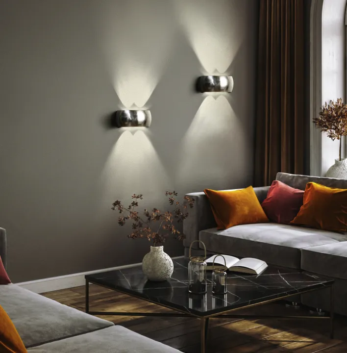 Die LED Wandleuchte aus der Serie ALBI präsentiert sich in einem modernen, abgerundeten Design mit einer Breite von 20 cm und einer Tiefe von 10 cm. Die Oberfläche des Metallkörpers zeigt eine strukturierte, leicht raue Textur in einer alu- beziehungsweise nickelfarbigen Optik. Die Form ist rund und die Lichtaustrittsöffnungen sind oben und unten sichtbar, was für eine effektvolle indirekte Beleuchtung sorgt. Die Hauptfarbe Aluminium/Nickel wird durch das silberne, reflektierende Finish unterstrichen, das dem Raum einen modernen Akzent verleiht.