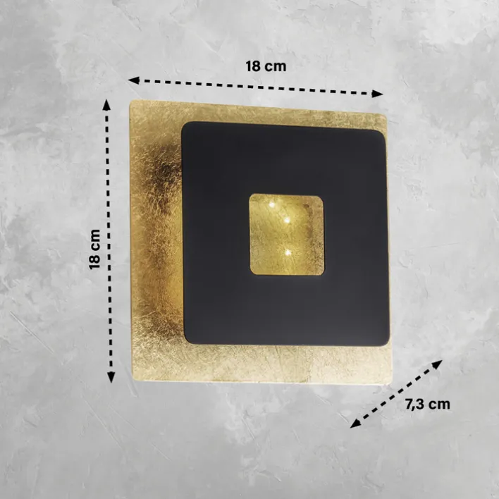 Die FISCHER & HONSEL LED Wandleuchte HENNES ist 18 breit und 18 hoch, bei einer Tiefe von 7,3 cm. Sie ist aus Metall in Sandschwarz mit blattgoldfarbenem Hintergrund.
