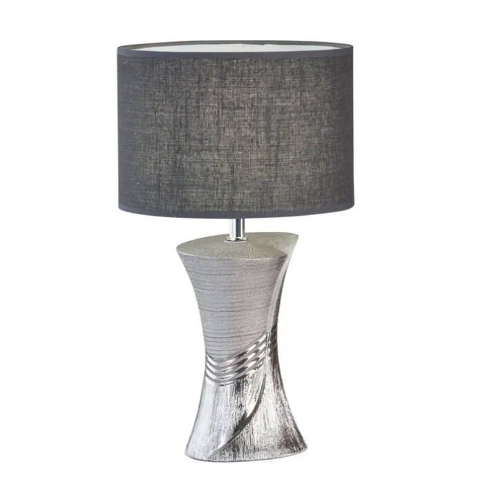 Fast wie ein Kunstwerk wirkt die Retrofit Tischlampe LOUIS von FISCHER & HONSEL mit ihrem grauen Stoffschirm aus Leinen und der silberfarbigen, unregelmäßig ausgeformten Basis aus Keramik mit den eingeschriebenen Linien. Der Lampenschirm hat einen Durchmesser von 25 Zentimetern, die 44 Zentimeter hohe Tischlampe findet also auch auf jedem Nachttisch Platz.