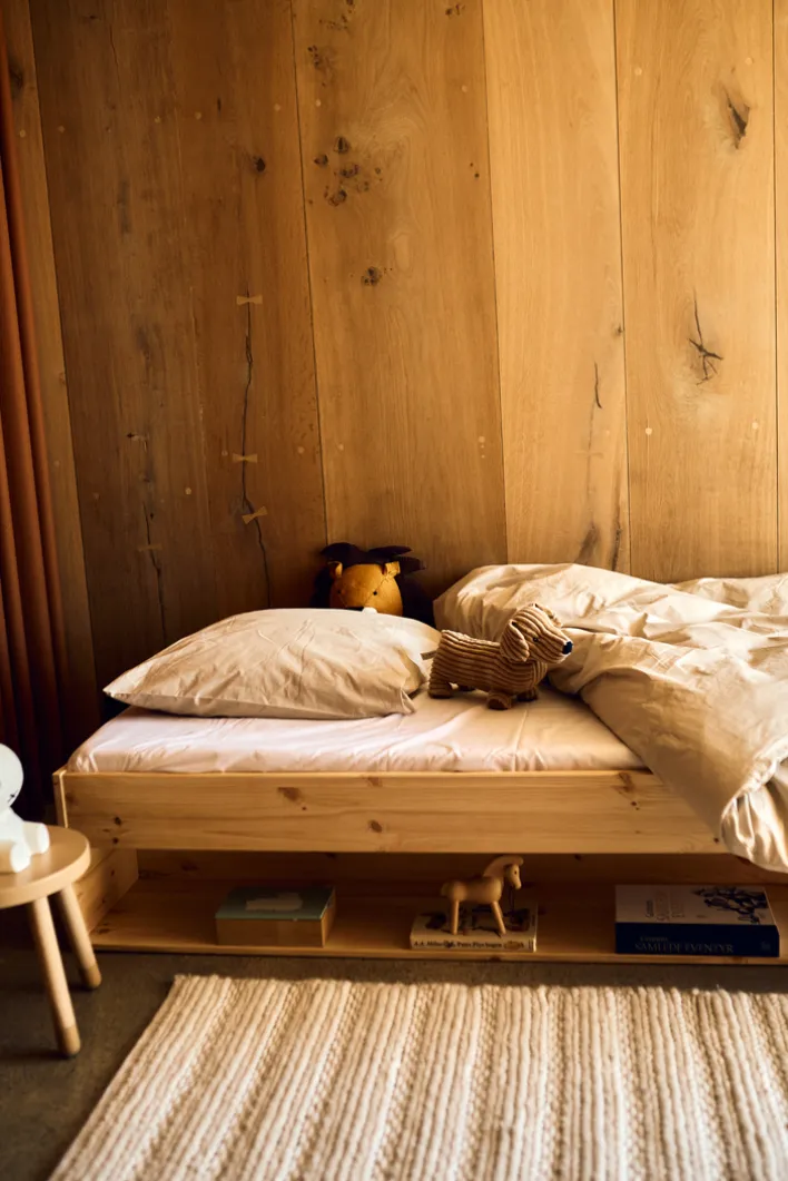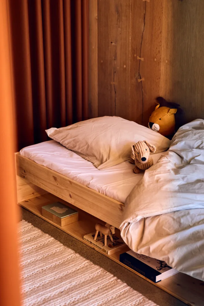 Das Bett ist in einem natürlichen Braunton gehalten, der die Maserung des Kiefernholzes schön zur Geltung bringt. Es ist mit einem Lattenrost ausgestattet, jedoch ohne Matratze. Die maximale Belastbarkeit beträgt 100 kg, was es zu einer stabilen Wahl für den täglichen Gebrauch macht. Der offene Stauraum unter dem Bett bietet zusätzlichen Platz für Aufbewahrungslösungen. Dieses Bett ist ideal für alle, die Wert auf Qualität und zeitloses Design legen.
