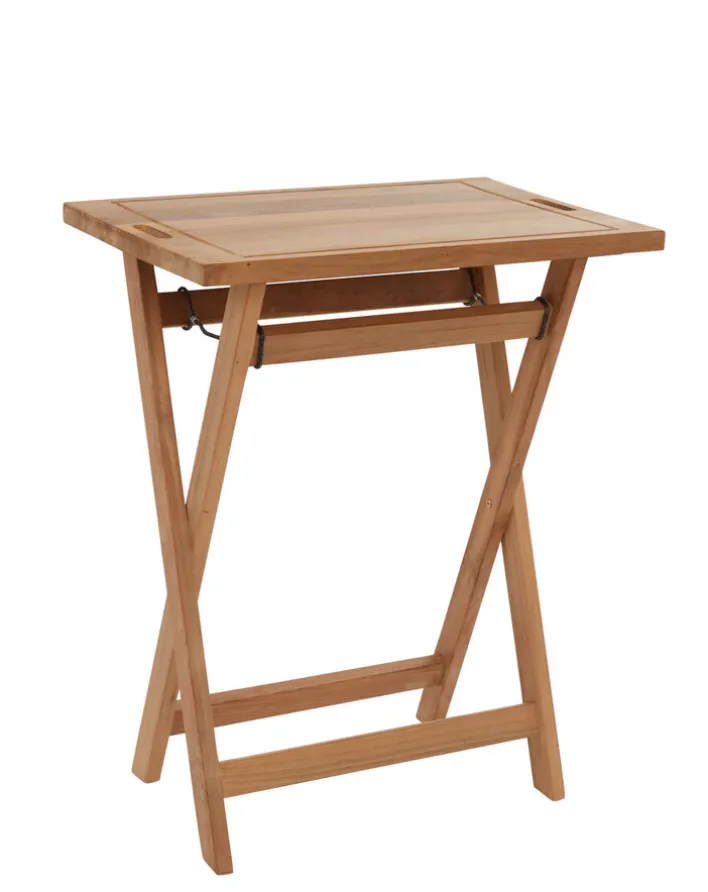 Der Garden FLAIR Garten-Beistelltisch OTTO ist 70 cm lang, 45 cm breit und 87 cm hoch. Er ist aus recyceltem braunem Teakholz, klappbar und hat eine abnehmbare Tischplatte.