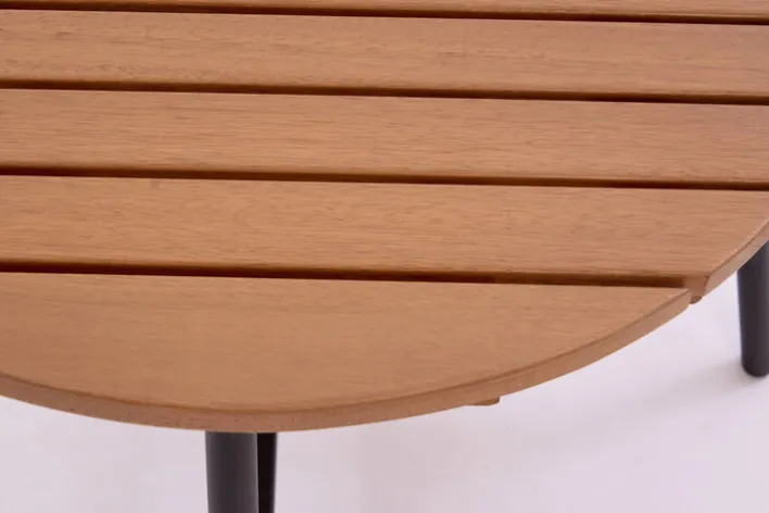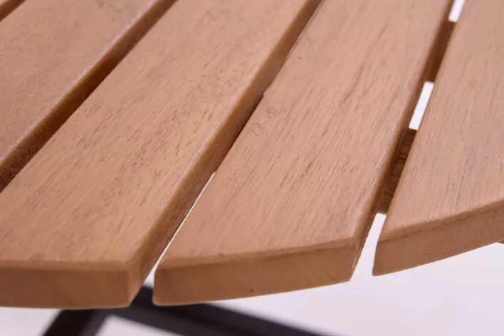 Das Gestell des Tisches besteht aus Aluminium in der Farbe Grau. Die funde geformte Tischfläche in lamellenoptik ist aus FSC recyceltem Teakholz gemacht und somit besonders nachhaltig produziert.