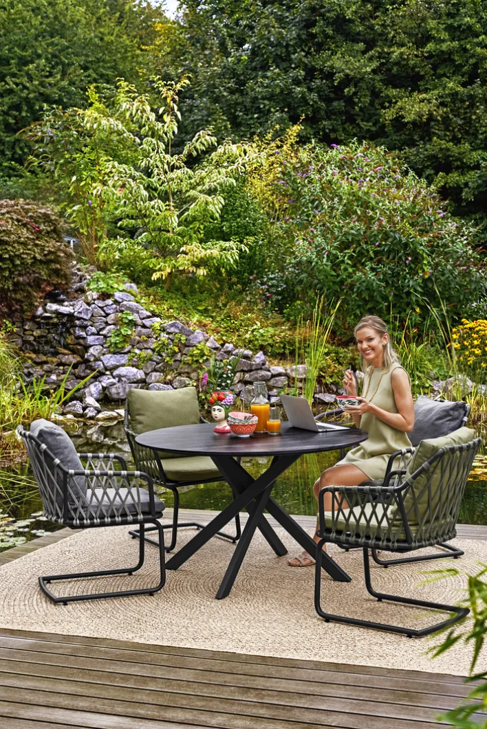 Der Garden FLAIR Gartenstuhl RIKA hat ein modernes Design und ist das ideale Sitzmöbel für die Terrasse, den Garten oder den Balkon. Durch das Untergestell im Farbton Anthrazit und Bezüge in Rope grau bieten sich zahlreiche Kombinationsmöglichkeiten mit bereits vorhandenen Möbeln. Die Seilgeflechtoptik an den Armlehnen fällt sofort ins Auge. Der Stuhl mit Schwinggestell und Armlehnen bietet stets eine angenehme und komfortable Sitzposition.
