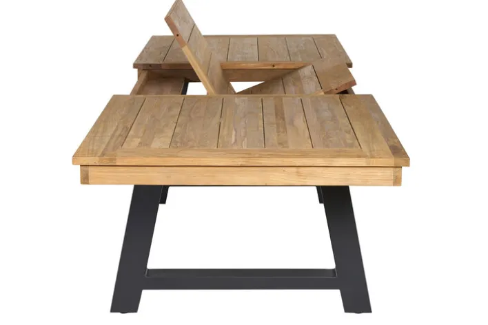 Der große Gartentisch OLI von Garden FLAIR hat die Maße 220 x 100 cm und präsentiert sich elegant in einem zeitlosen Design. Durch die wunderschöne Tischplatte aus Teak und das A-Gestell im Farbton Sandschwarz fällt der rechteckige Tisch sofort ins Auge und ist leicht mit verschiedenen Gartenstühlen kombinierbar. Ausgestattet mit einem Auszug, ist der Tisch auf 300 cm verlängerbar und bietet Platz für 8 bis 10 Personen. Der schöne Gartentisch für den Innen- und Außenbereich schafft auf der Terrasse oder im Garten eine angenehme Atmosphäre.