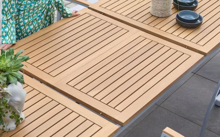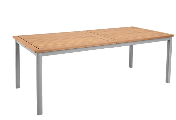 Das klassische, klar strukturierte Gestell besteht aus strapazierfähigem Aluminium. Aus massivem Eukalyptusholz entsteht die geteilte Tischplatte. Eine sorgfältige Lackierung schützt das natürliche Material. Die attraktive ursprüngliche Maserung bleibt dennoch bewusst sichtbar. Kombinieren Sie den Gartentisch Salzburg mit passenden Gartenstühlen und weiteren Möbeln aus derselben Serie.