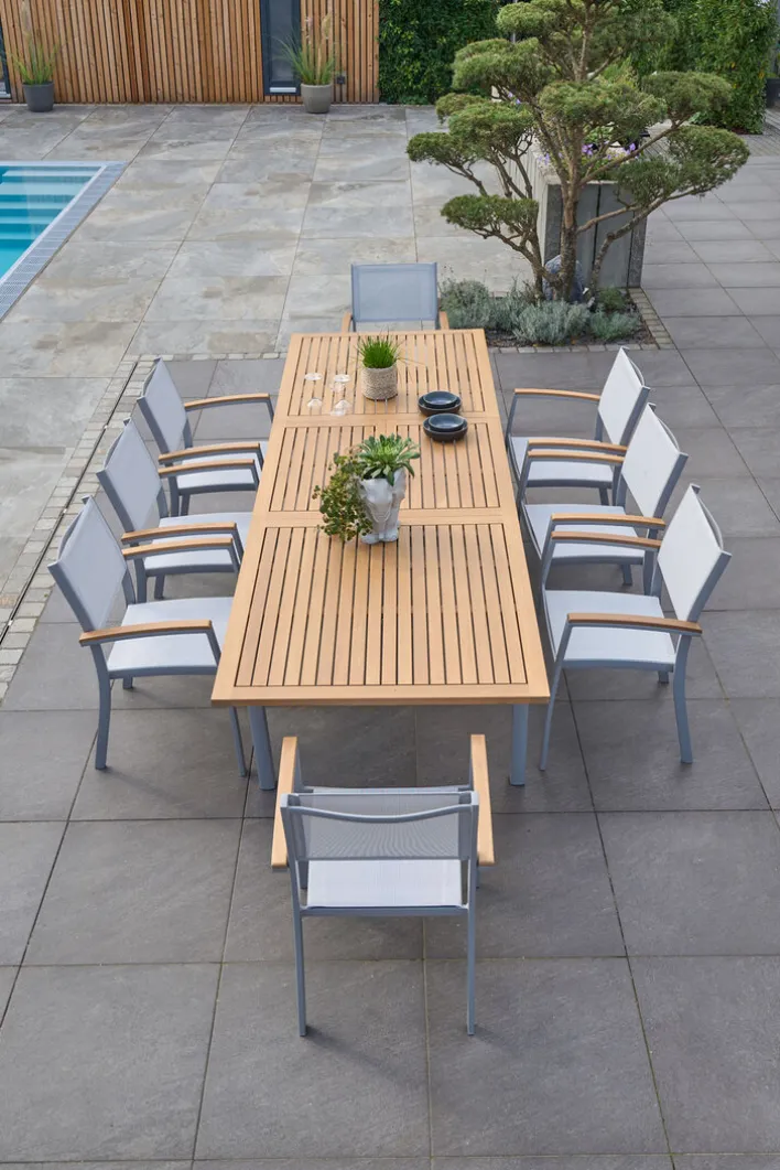 Der Gartentisch SALZBURG in der Größe L/B 214 – 300 x 100 cm bildet den Mittelpunkt Ihrer Sitzgarnitur auf der Terrasse sowie im Wintergarten. Durch die Ausziehfunktion lässt er sich auch für eine gesellige Runde, etwa einen Grillabend, nutzen.