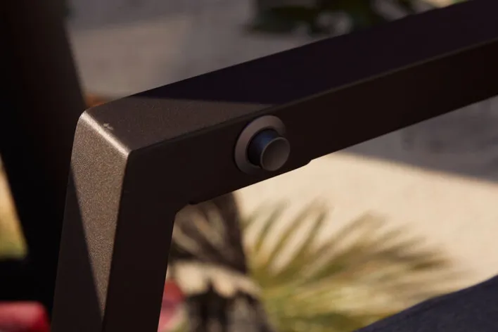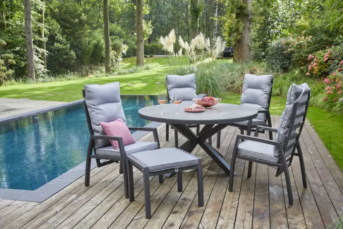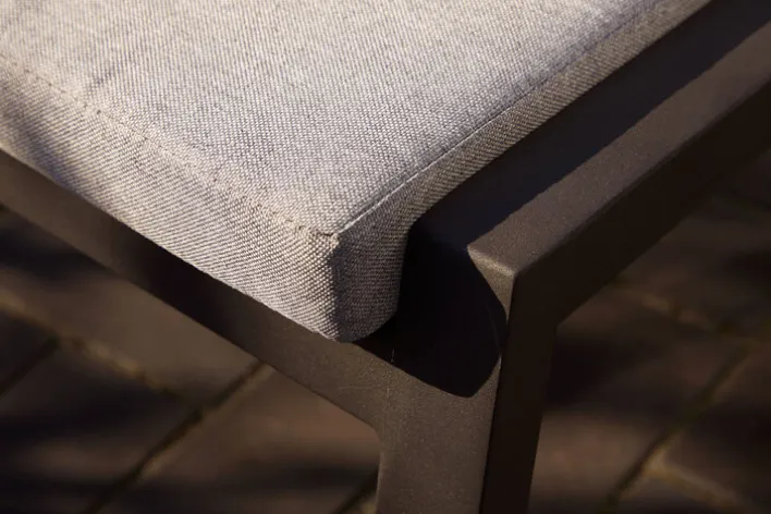 Ein Knopfdruck reicht, schon bewegt sich die gemütliche Lehne von Gartenstuhl LEWIS in die gewünschte Position. Möglich macht das eine stufenlos einstellbare Gasdruckfeder. Sie ist in das Vierfußgestell aus grauem Aluminium integriert und wie der Stuhl für ein Maximalgewicht bis 110 kg ausgelegt. Gepolstert mit einer abnehmbaren Auflage in elegantem Hellgrau kann man hier entspannt speisen, Zeitung lesen oder sonnenbaden. Der bequeme Gartenstuhl ist mit weiteren Outdoor Möbeln der gleichnamigen Serie oder anderen Gartenmöbeln kombinierbar.