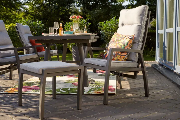 Eigenschaften Gartenmöbel: Armlehnen inklusiveDiningHochlehnerMulitpositionsstuhlPolsterauflage inklusiveRückenlehne verstellbarRückenpolster loseRückenlehne verstellbar durch Knopfdruck an der Armlehne