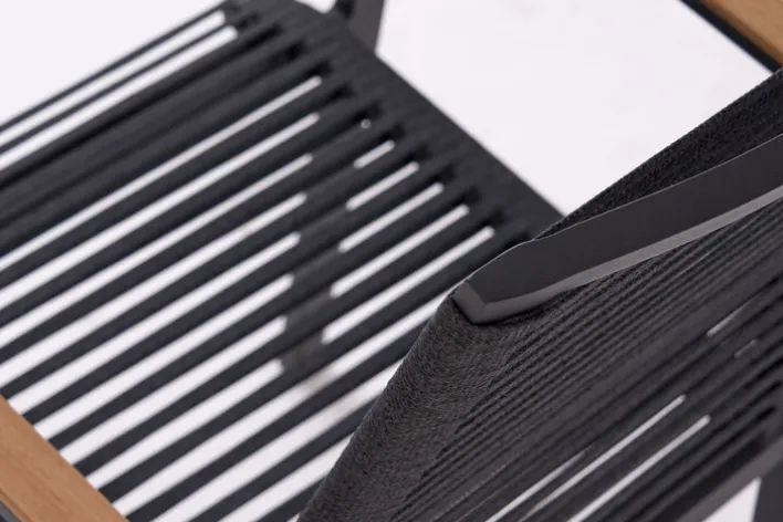Der Garden FLAIR Stapelstuhl Garten LEIF in Schwarz/Rope ist 89 cm hoch, 56 cm breit und 61 cm tief. Er ist aus schwarzem Aluminium mit Armlehnen aus Holz und einem Geflecht aus Kunstfasern.