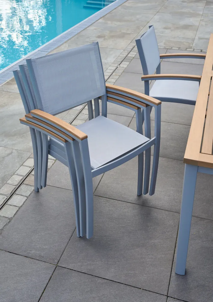 Der Garden FLAIR Stapelstuhl Garten SALZBURG besteht aus Aluminium und einem textilen Outdoorgewebe in hellgrau. Er besitzt zwei Armlehnen und ist äußerst platzsparend, da stapelbar.