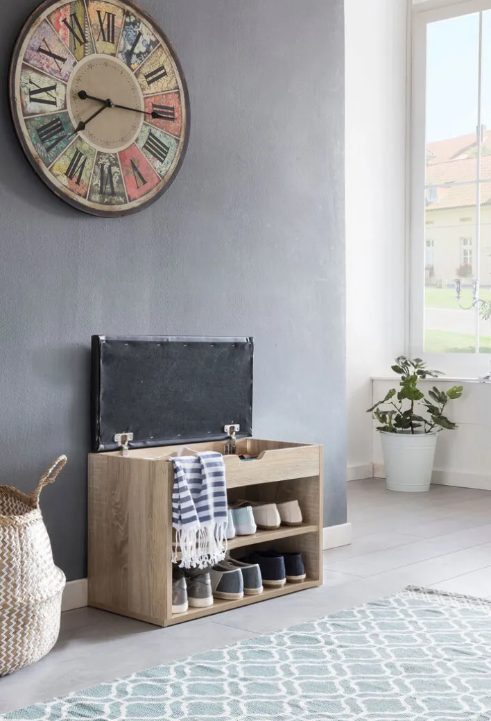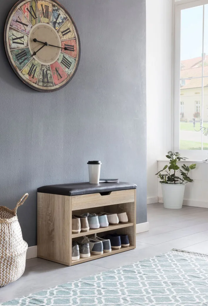Die in den Farbtönen Grau und Braun gestaltete Garderobenbank findet mit den Maßen 60 Zentimeter Breite, 30 Zentimeter Tiefe und einer Höhe von nur 44 Zentimetern in jeder Diele einen Platz. Das offene Modell fungiert gleichzeitig als Sitzbank.
