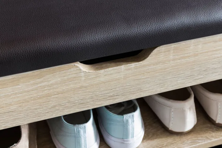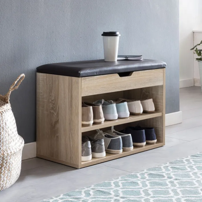 Das Regal mit der praktischen Klapp-Funktion ist aus Spanplatten gearbeitet. Unter der Klappe befindet sich ausreichend Raum für das Schuhputzzeug und einen Schuhanzieher. Die Sitzfläche ist dick gepolstert, sodass das Anziehen der Schuhe sehr bequem ist. Der Bezug der Polsterung ist aus leicht zu reinigendem Kunstleder. Bei einem Eigengewicht von 15 Kilogramm kann das Regal bis zu 80 Kilogramm belastet werden.