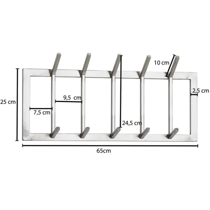 Diese Garderobenleiste im rechteckigen Design misst 10 cm in der Tiefe, 65 cm in der Breite und 30 cm in der Höhe bei 3 kg Gewicht. Die maximale Belastbarkeit liegt bei 10 kg. Die Garderobenleiste ist aus silberfarbigem Metall in der Metallart von Stahl gearbeitet und bringt eine Hochglanzoptik mit.