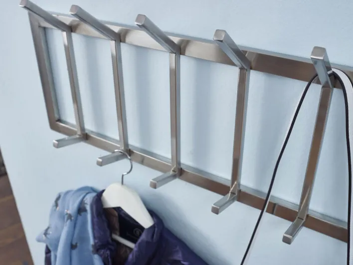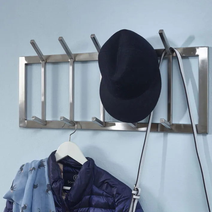 Ihr modernes und gleichzeitig schlicht-elegantes Design macht die Garderobenleiste zum schönen Hingucker im Eingangsbereich. Ebenso eignet sie sich als praktische Aufhängemöglichkeit im Schlafzimmer. An den fünf Doppelhaken mit insgesamt zehn Aufhängmöglichkeiten finden Jacken, Schals und Taschen jede Menge Platz. Diese Garderobenleiste ist ausschließlich für die Verwendung in Innenbereichen geeignet.