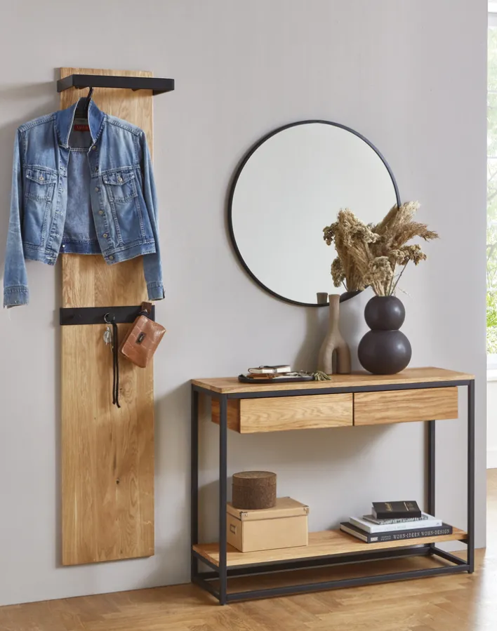 Die Kleiderstange am oberen Ende des Garderobenpaneels lädt Gäste und Familie ein, ihre Kleidung dort aufzuhängen, während sich im mittleren Bereich 3 Haken befinden, an denen sich Taschen oder Schlüssel aufbewahren lassen. Die dekorative Maserung der Eiche vermittelt sofort Natürlichkeit und Wohlbefinden für alle, die zur Tür hereinkommen. Wer die Natürlichkeit des Flures unterstreichen möchte, kann dazu einen Parkettboden aus Eiche kombinieren. Darüber hinaus lässt sich das Paneel in nahezu alle bestehende Einrichtungsstile integrieren.