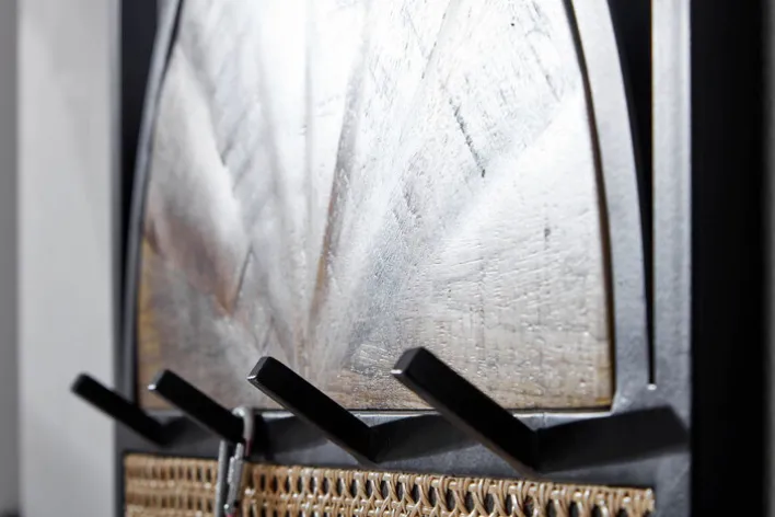 Das 53 x 40 cm große Garderobenpaneel Mango von verströmt fast schon orientalische Akzente in den heimischen vier Wänden – könnte aber genauso gut dem angesagten Bohemian-Style zugeordnet werden. Die rechteckige Form des Paneels wird durch das halbrunde Deko-Element in der Mitte geschickt durchbrochen, auch das Flechtmuster zwischen den Haken weckt Assoziationen an ferne Länder.