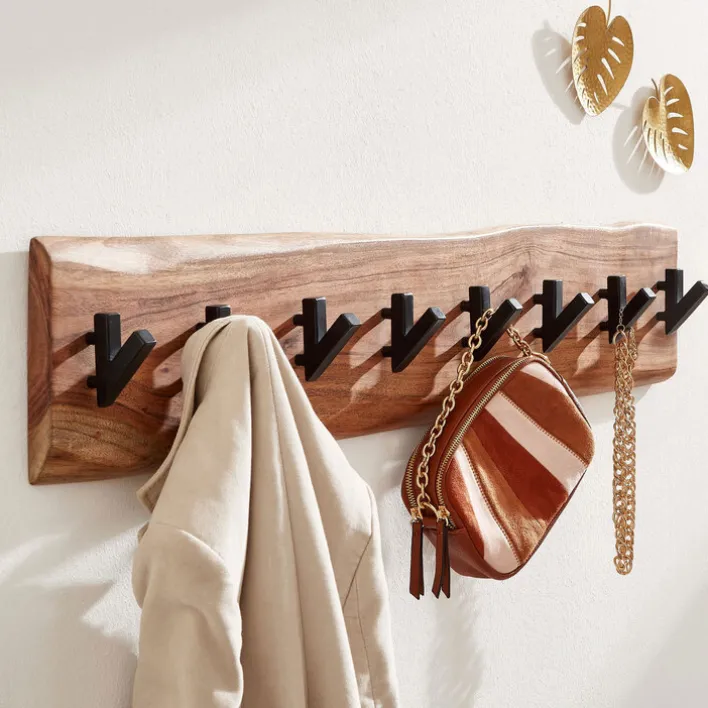 Mit insgesamt 9 Haken ist das Garderobenpaneel für die meisten Haushalte geeignet. Die Grundplatte ist aus Massivholz gefertigt. Es handelt sich um Akazie mit lackierter Oberfläche. Die Kleiderhaken sind aus Metall hergestellt. Sie sind mit einer schwarzen Lackschicht versehen. Die maximale Belastbarkeit gibt der Hersteller mit 6 kg an. Das Garderobenpaneel kommt wird teilmontiert ausgeliefert. Seine Ausladung inklusive der Haken beläuft sich auf 9 cm.