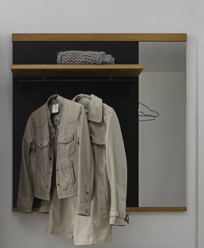 Das Paneel ist aus hochwertigen Materialien gefertigt, darunter Holz, Holznachbildung, Metall und Spiegelglas. Die lackierte Oberfläche sorgt für eine langlebige und pflegeleichte Nutzung. Es verfügt über drei Haken und eine Kleiderstange, die ausreichend Platz für Jacken und Mäntel bieten. Die Spiegelfront ist nicht nur praktisch, sondern verleiht dem Raum auch eine optische Tiefe. Mit Soft-Close-Funktion und zusätzlichem Stauraum ist dieses Garderobenpaneel eine ideale Lösung für jeden Eingangsbereich.