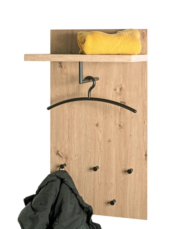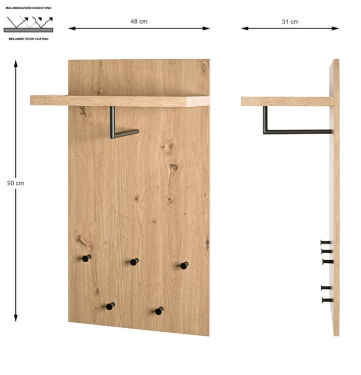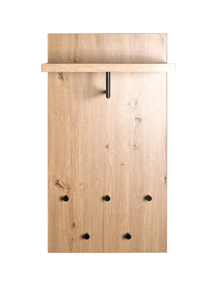 Farblich besticht das Möbelstück hauptsächlich durch helles Eiche-Dekor mit Farbakzenten. Das Garderobenpaneel PARMA1 umfasst zudem eine praktische Hutablage. Des Weiteren lässt sich durch eine Kleiderstange, welche inklusive ist, beispielsweise eine Jacke am Paneel aufhängen. Das moderne Möbelstück besteht aus mitteldichten Faserplatten (MDF) und Metall. Die Oberfläche ist pulverbeschichtet. Als Garderobenpaneel für die Wand eignet sich das 9,3 kg schwere Möbelstück auch für den Bereich im Flur. Dort finden dann neben Jacken und Hütten weitere Utensilien wie Taschen und Co. einen Platz.