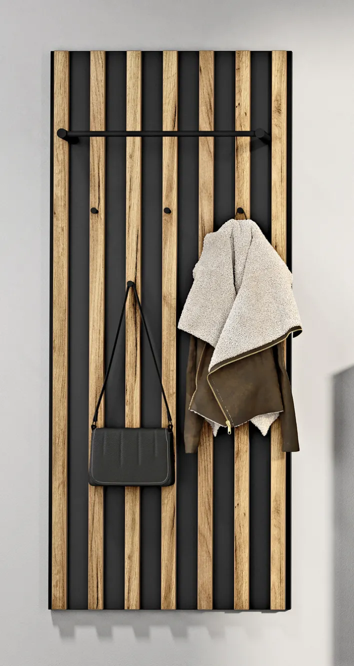 Das Garderobenpaneel RENELL vereint modernes Design mit praktischer Funktionalität. Mit einer Breite von 64 cm, einer Höhe von 148 cm und einer Tiefe von 27 cm bietet es ausreichend Platz für Ihre Garderobe. Die Hauptfarbe des Paneels ist ein elegantes Braun, kombiniert mit einem ansprechenden Graphit- und Navarra-Eiche-Dekor. Diese Farbkombination verleiht dem Paneel eine zeitgemäße und stilvolle Optik, die sich nahtlos in verschiedene Wohnstile einfügt. Das Paneel besteht aus einer hochwertigen Holznachbildung und Metall, was für Stabilität und Langlebigkeit sorgt. Es ist mit fünf Haken und einer Kleiderstange ausgestattet, die ausreichend Platz für Jacken, Mäntel und Accessoires bieten. Die vertikalen Holzstreifen in Eiche-Dekor setzen einen natürlichen Akzent und harmonieren perfekt mit dem modernen Stil des Paneels. Dieses Garderobenpaneel ist eine ideale Lösung für Flure und Eingangsbereiche, die sowohl Funktionalität als auch ästhetischen Anspruch vereinen.