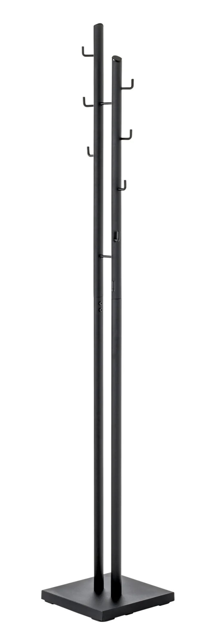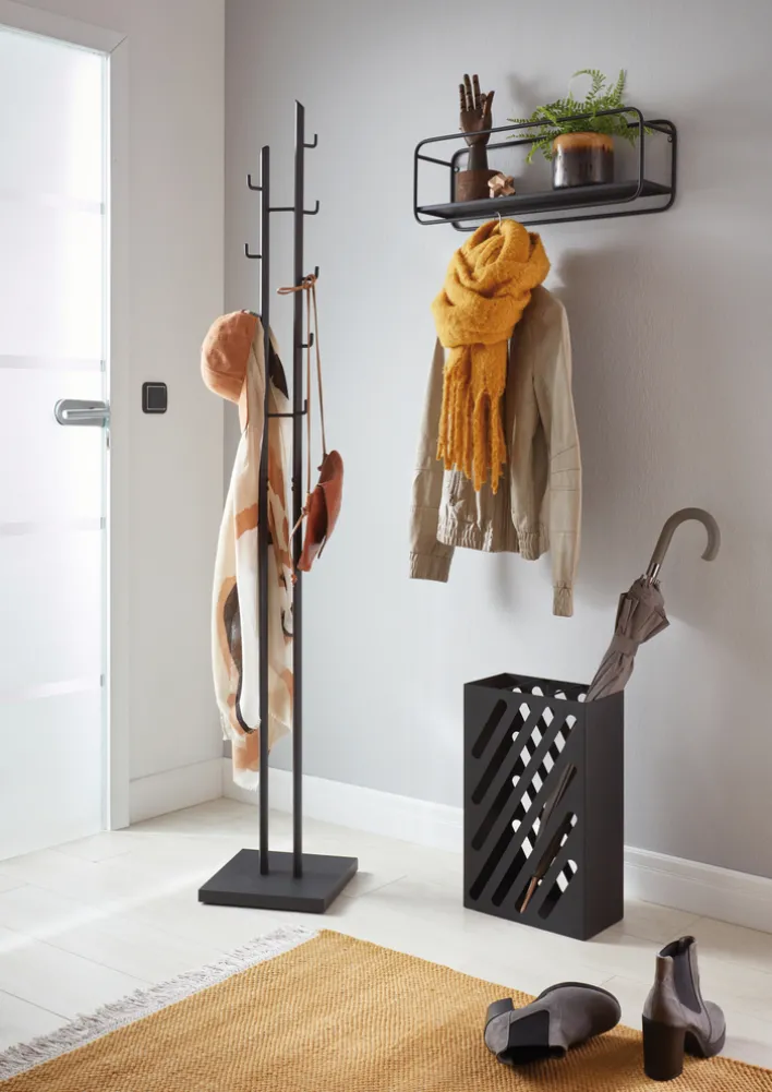 Der schwarze Garderobenständer ist mit den Maßen 29 Zentimeter Breite, 176 Zentimeter Höhe und 29 Zentimeter Tiefe ideal für Ecken in kleinen Dielen oder Wartezimmern geeignet. Der hohe Ständer steht mit einem Gewicht von 6,48 Kilogramm sicher auf jedem Boden wie Parkett oder Läufern.