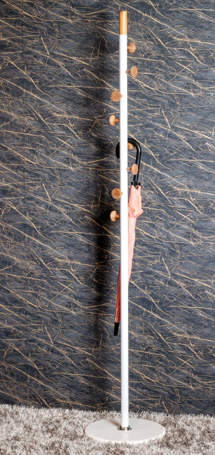 Für den Flurbereich kommt neben der klassischen Garderobe auch ein Garderobenständer als Einrichtungsgegenstand infrage. Dieses moderne Möbelstück ist solch ein Kleiderhalter mit einer Höhe von 178 cm und einer Tiefe von 35 cm. Die Grundlage des 35 cm breiten Produkts bildet eine Marmorplatte. Zudem kommen hier Materialien wie Massivholz und Metall zum Einsatz. Die Stange des Flurmöbelstücks ist weiß, während die Garderobenhaken durch die Farbe des Holzes geprägt sind.
