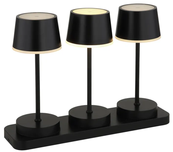 Die Akku LED Tischleuchte DAWSON von GLOBO vereint modernes Design mit praktischer Funktionalität. Dieses Set besteht aus drei stilvollen Tischlampen, die auf einer eleganten Ladestation platziert sind. Die Lampen sind in einem zeitlosen Schwarz gehalten und bestehen aus einer Kombination von Kunststoff und Metall, was ihnen eine robuste und dennoch ansprechende Optik verleiht. Die konische, runde Form der Lampenschirme ergänzt den skandinavischen Stil, der sich nahtlos in verschiedene Wohnumgebungen einfügt.