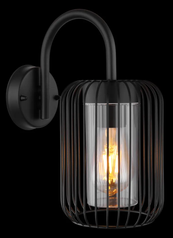 Die Retrofit Außenlampe NINA von GLOBO hat einen schwarzen geschwungenen Korpus aus Edelstahl, an dem eine E27 Retrofit Lampenfassung befestigt ist. Diese wird zum Spritzwasserschutz von einem klaren Kunststoffzylinder umgeben und hat einen mattschwarzen Schirm in Geflechtoptik. Die Fassung der Außenleuchte kann LEDs mit E27 Fassung und bis zu 15 Watt Leistung aufnehmen.