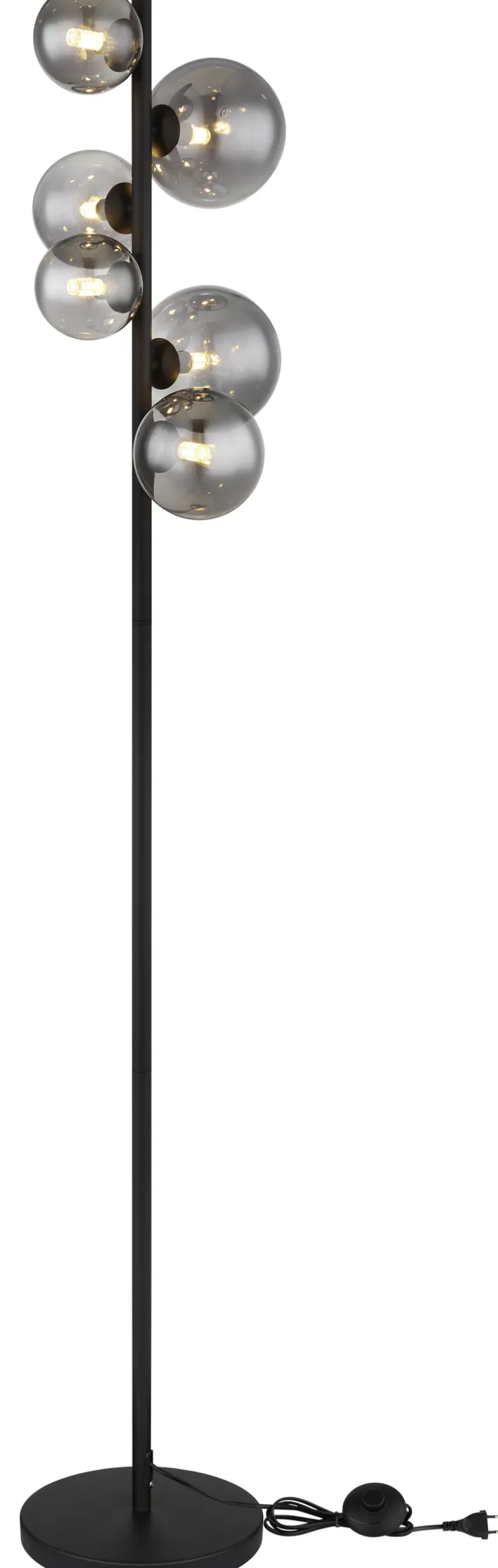Die LED Retrofit Stehlampe RIHA von GLOBO hat ein dekoratives Design. Schirme aus rauchig grauem Glas befinden sich im oberen Bereich einer schwarzen Metallstange. Die Stehleuchte hat eine Höhe von 155 cm.