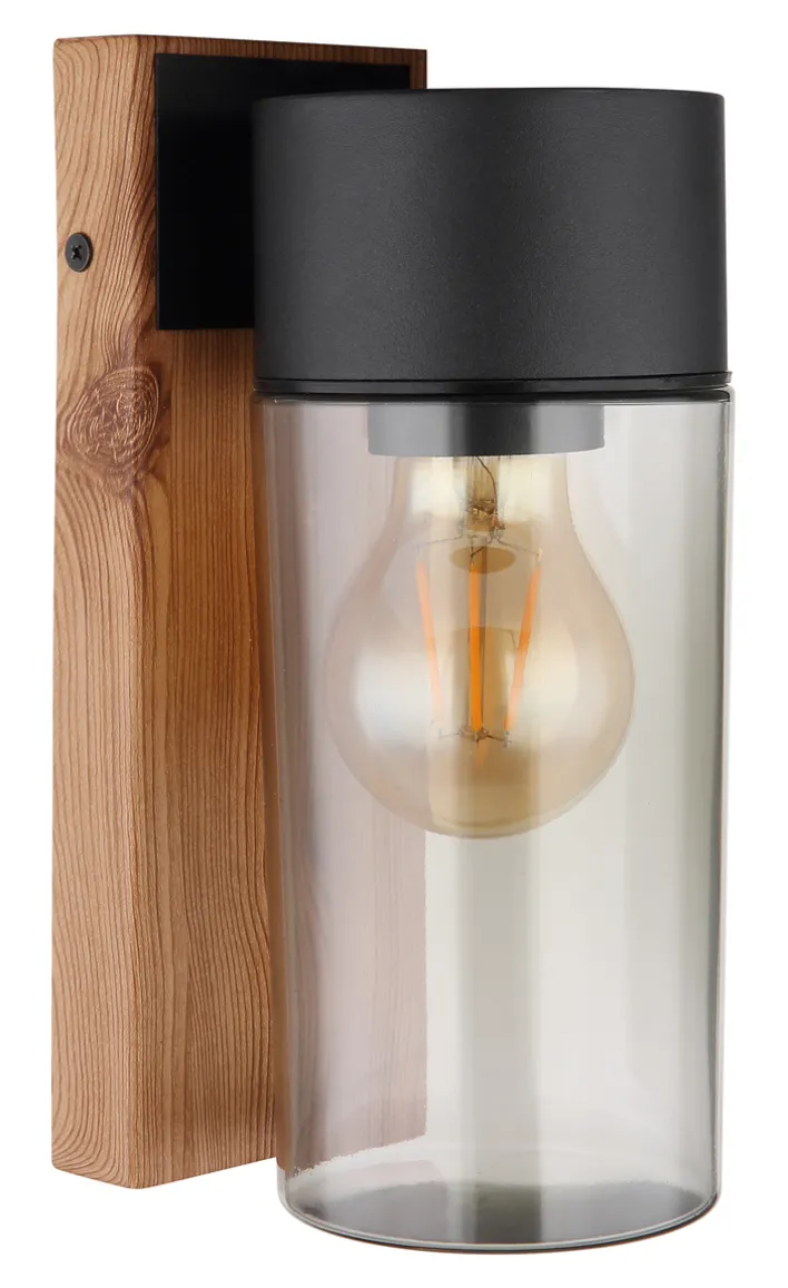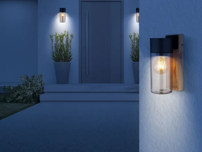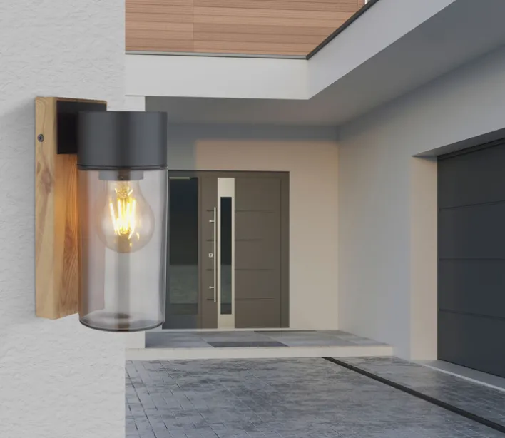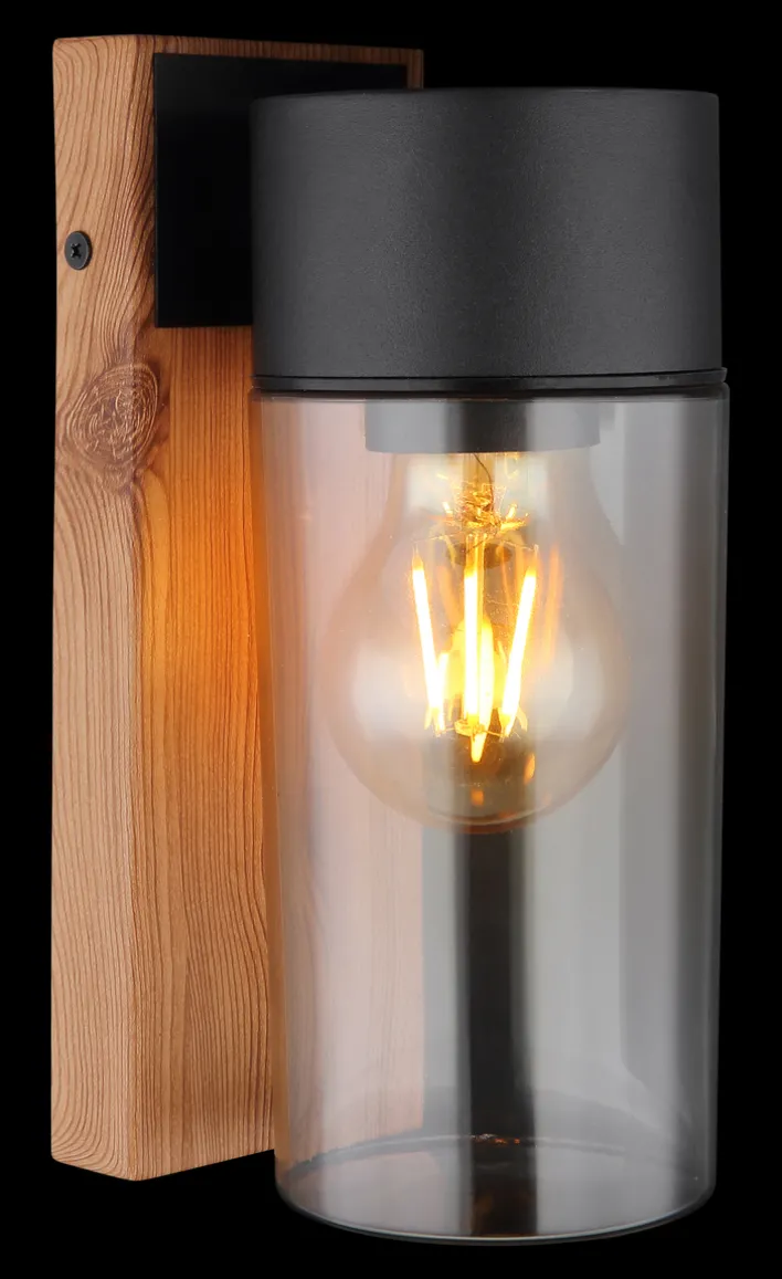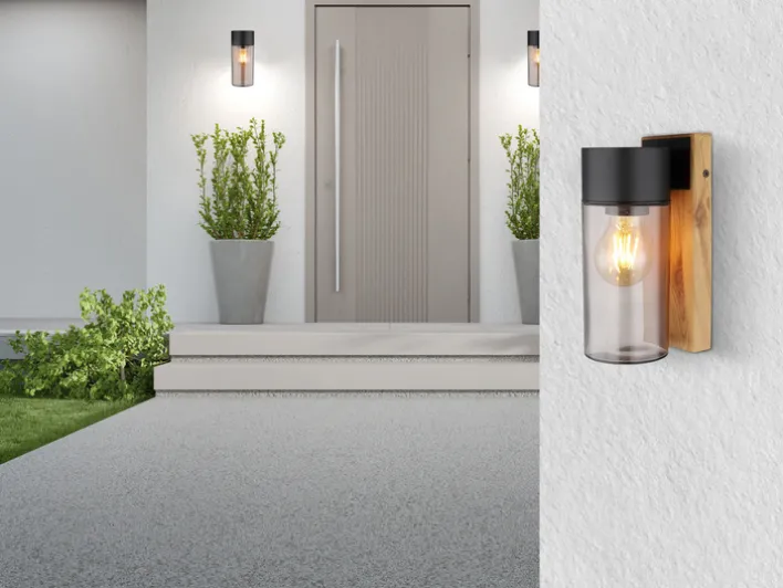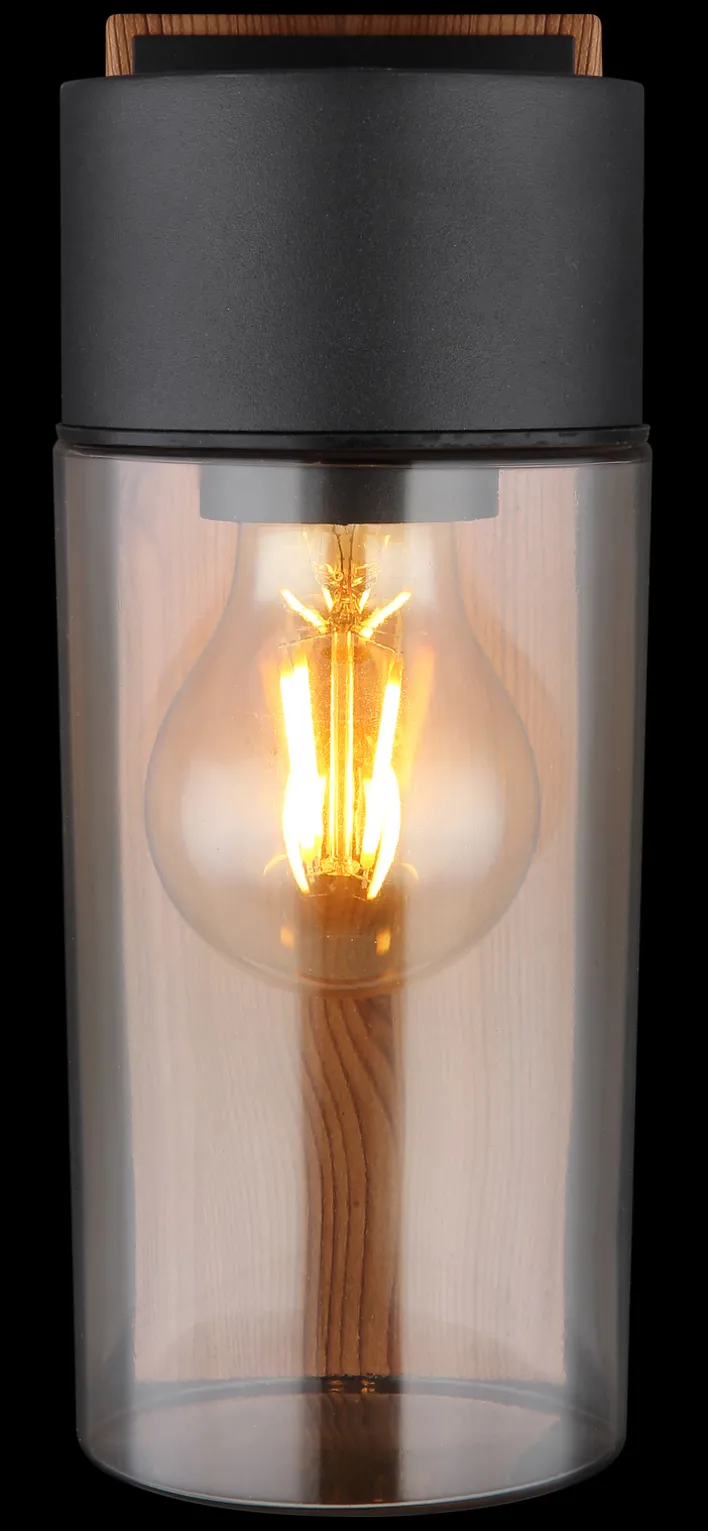 Die spritzwassergeschützte Außenlampe ETSI von GLOBO verfügt über einen Korpus in brauner Holzoptik und schwarzem Edelstahl. Daran ist ein zylindrisches Glas aus transparentem grauen Glas befestigt. In die E27 Retrofit Fassung können unterschiedliche LEDs mit bis zu 40 Watt Leistungsverbrauch eingeschraubt und bei Bedarf einfach gewechselt werden. So kann die Lichtfarbe- und -helligkeit der Außenwandleuchte ETSI aus dem Hause GLOBO nach den eigenen Bedürfnissen festgelegt werden.