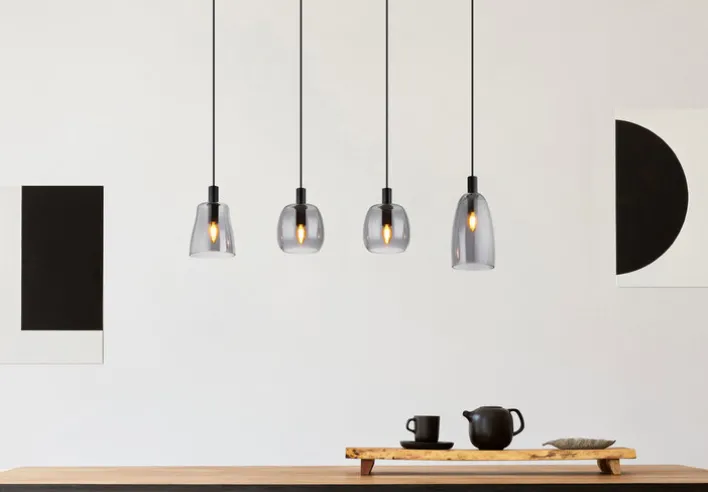 Bei der Pendellampe GARRI von GLOBO hängen vier schwarze, höheneinstellbare Pendel an einer schwarzen Leiste. An jedem Pendel sind eine schwarze Lampenfassung sowie ein Schirm aus rauchfarbig grauem Glas befestigt. Dabei weisen die Glasschirme drei verschiedene Formen auf. In die E27 Retrofit Fassungen können unterschiedliche Leuchtmittel mit bis zu 40 Watt (insgesamt maximal 160 Watt) eingeschraubt werden, die dank des rauchfarbigen Glases ein leicht gedämpftes Licht ausstrahlen.