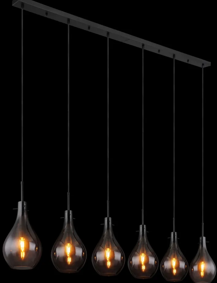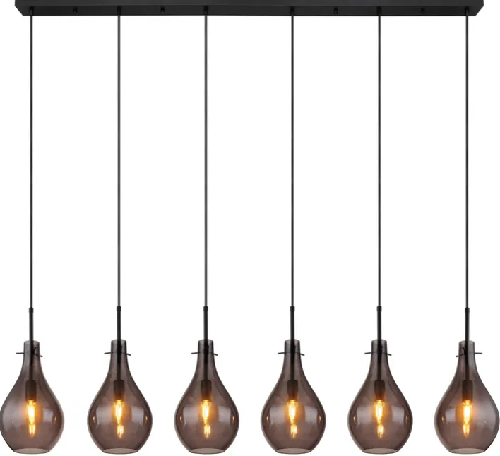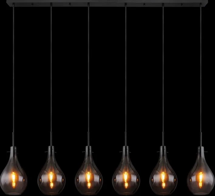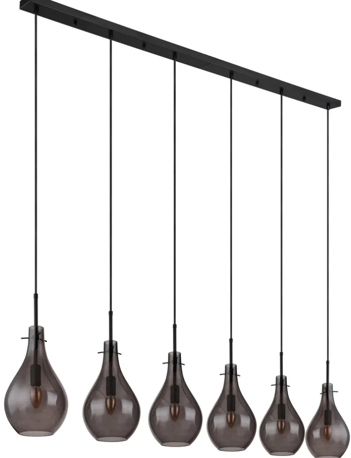 Das 6-flammige Retrofit Balkenpendel OSKUS von GLOBO hat ein zeitloses Design und passt in moderne und klassische Wohn- oder Esszimmer. Durch die tolle Retrooptik mit Lampenschirmen aus Rauchglas ist die Leuchte in der Farbe Schwarz ideal für große Esszimmer- und Wohnzimmertische. Das hochwertige Balkenpendel fügt sich harmonisch in bereits bestehende Einrichtungen ein und schafft eine behagliche Atmosphäre und ein angenehmes Licht.