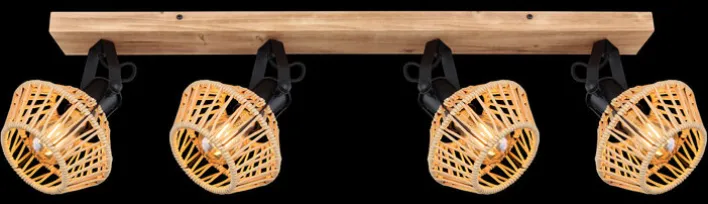 Die stilvoll gestaltete Retrofit Deckenlampe VALLI von GLOBO mit 4 Spots passt in moderne oder klassische Einrichtungen und verleiht jedem Raum einen einzigartigen Retro-Charme. Durch die Kombination aus Holz, schwarzfarbigem Metall und Lampenschirmen mit Hanf im Farbton beige, ist die etwa 80 cm breite Leuchte ein Blickfang. Die Leuchte passt in Wohn- oder Esszimmer und ist auch für einen Eingangsbereich ideal. Mit ihren individuell dreh- und schwenkbaren Schirmen sorgt die Deckenlampe für eine angenehme Beleuchtung.
