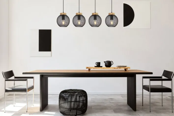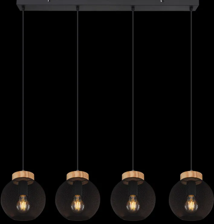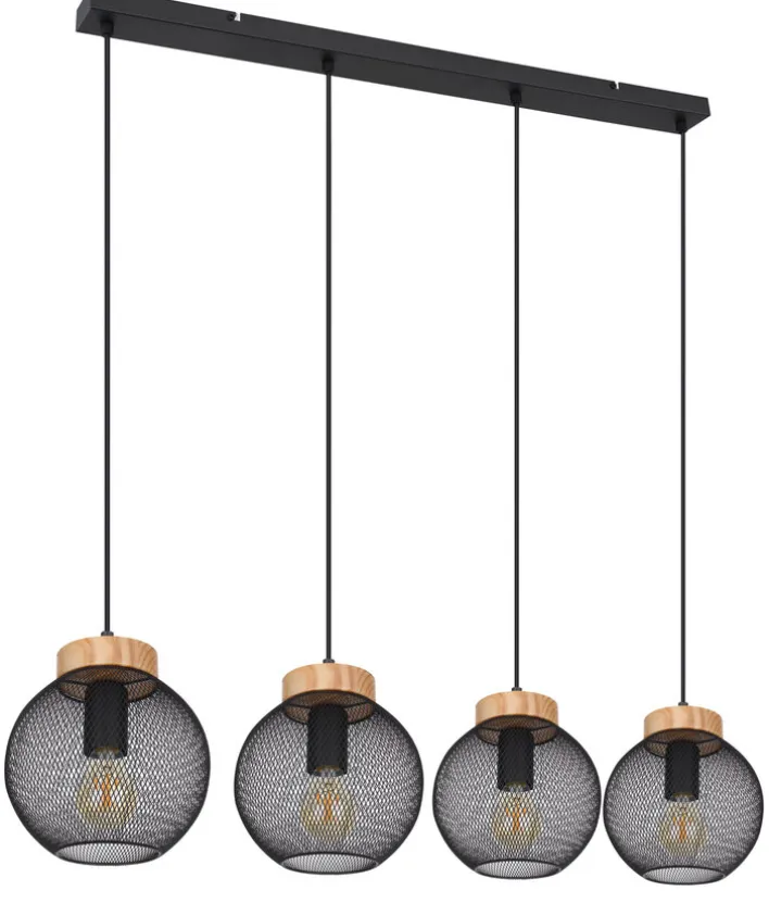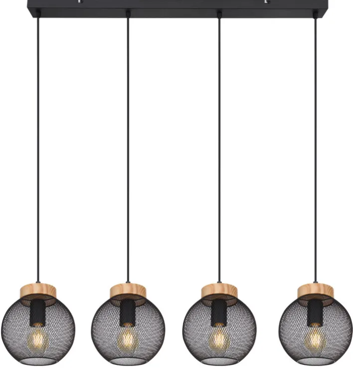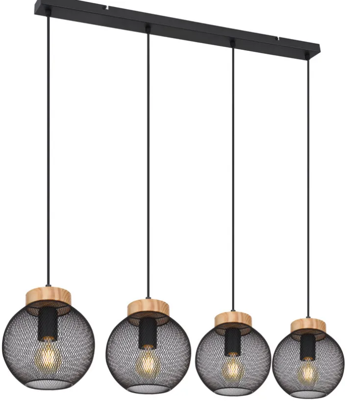 Die vier Kugeln der Lampe werfen mit dem aparten Gittermuster einen feinen Lichtschein in jeden Raum. Die Pendelleuchte mit den Fassungen aus braunem Holz und der schwarzen Deckenleiste hängt mit einem geringen Gewicht von nur 2,48 Kilogramm sicher an jeder Decke. Die Gitterkugeln sind aus langlebigem Metall gearbeitet. Die vier Leuchtmittel bieten mit jeweils 40 Watt zusammen insbesondere über Tischen eine angenehme Helligkeit von 160 Watt.