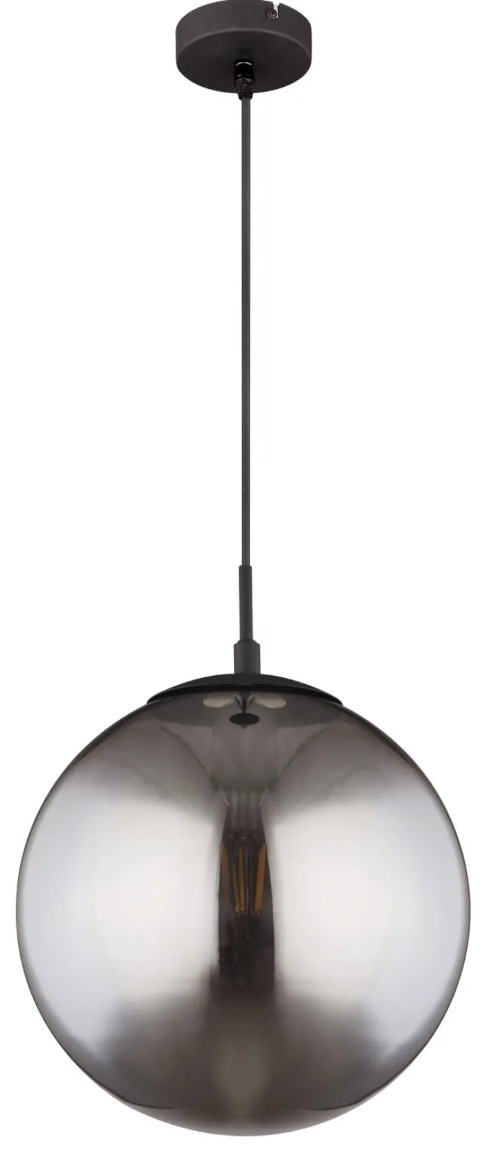 Die GLOBO Retrofit Pendelleuchte BLAMA begeistert mit ihrer attraktiven Kugelform und dem rauchfarbigen Glasschirm, der sich farblich harmonisch von dem schwarzen Korpus absetzt. Sie besitzt einen Durchmesser von 30 cm und wertet jeden Wohnraum auf.