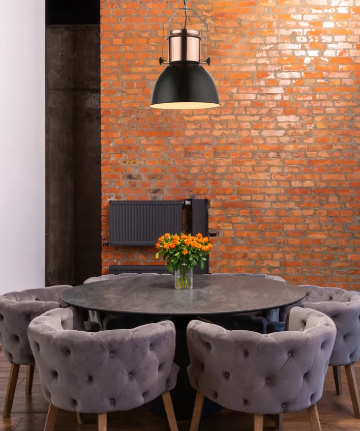 Die GLOBO Retrofit Pendelleuchte KUTUM hat einen Durchmesser von 26 cm, ihre Höhe beträgt 120 cm. Sie ist aus schwarzem und kupferfarbigem Metall, mit einem schwarzen Textilkabel