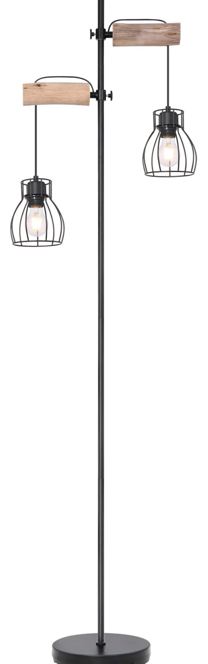Die GLOBO Retrofit Stehlampe MINA besteht aus einem stabilen Standfuß und einem 168 cm hohen Metallgestell in Schwarz. Absetzungen aus Holz verleihen der Lampe eine spannende Optik. Die Leuchtmittel sind in herabhängenden Käfigen untergebracht und sorgen für eine helle Beleuchtung. Für ideales Licht sorgen zwei Retrofit 40 Watt Lampen oder zwei 8 Watt LED Leuchtmittel mit E27 Fassung. Ein- und ausschalten lassen sich die zwei Arme der Stehlampe mit zwei Ein-/Ausschaltern direkt an den Lampenarmen. #porta #portamöbel #cozychristmas