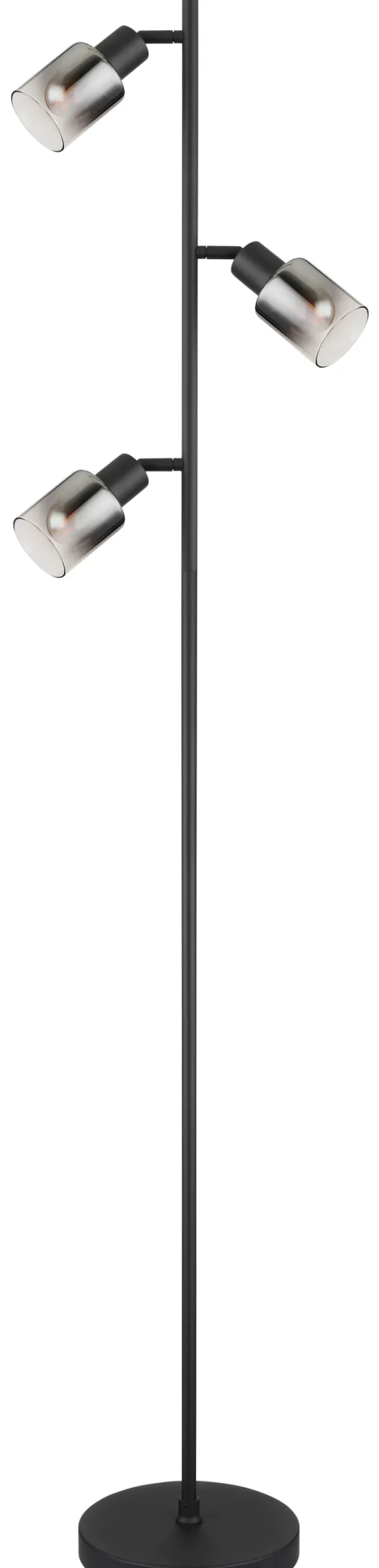 Die GLOBO Retrofit Stehleuchte HUBERTUS ist 154 cm hoch und hat einen Durchmesser von 23 cm, die Lampenschirme haben einen Durchmesser von 7 cm. Sie ist 3-flammig, aus schwarzem Metall und grauem, klaren Glas und verfügt über einen Fußschalter.
