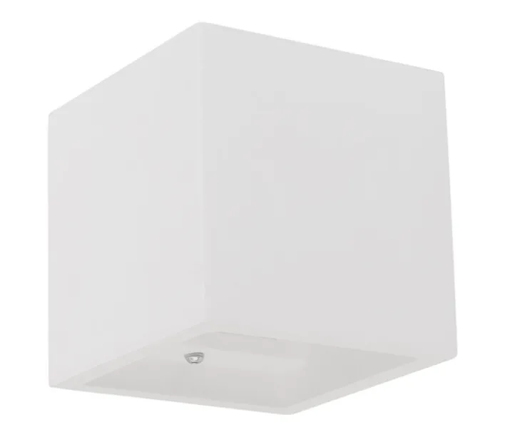 Das Up & Down Licht strahlt aus der würfelförmigen, weißen Wandleuchte CHRISTINE von GLOBO, die aus Gips gestaltet und optisch absolut unauffällig ist. Die Kanten des kleinen Würfels sind jeweils 11,5 Zentimeter lang.