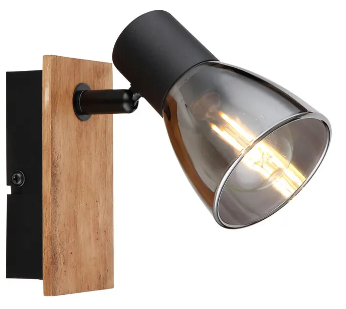 Dieser Strahler aus braunem Holz, schwarzem Metall und Rauchglas hat eine Ausladung von 15,5 cm, eine Höhe von 14 cm sowie eine Breite von 7 cm. Er ist verstellbar und verfügt über einen Ein-/Ausschalter. Das Leuchtmittel, das auswechselbar ist, kann separat bestellt werden. Es handelt sich dabei um einen AGL- und Retrofit-Beleuchtungstyp, der 40 Watt verbraucht. Diese Wandlampe kann sowohl verwendet werden, um im Raum Licht zu spenden oder um ein Wandbild zu beleuchten.