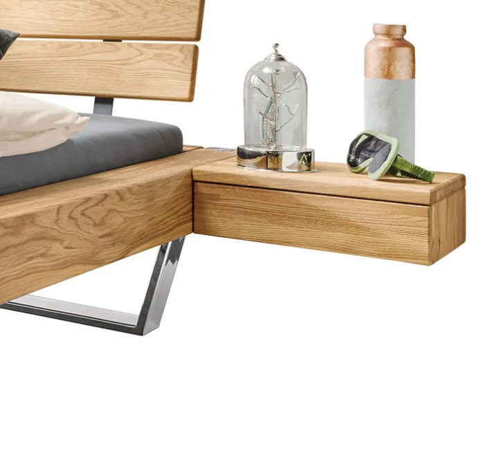 Die Hauptfarbe des Nachttisches ist Braun, ergänzt durch die dekorative Eichenoptik, die im Bild deutlich sichtbar ist. Die klare Linienführung und die glatte Oberfläche unterstreichen das minimalistische Design, während die stabile Metallhalterung für einen sicheren Stand sorgt. Dieser Nachttisch ist nicht nur ein praktisches Möbelstück, sondern auch ein stilvolles Element, das jedem Schlafzimmer eine besondere Note verleiht.