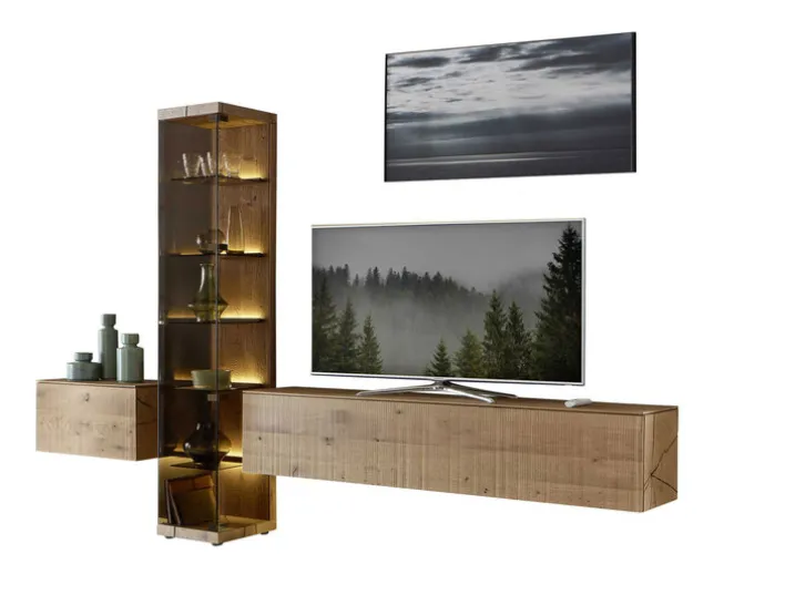 Die 3-teilige hartmann Wohnwand VARA besteht aus einer Standvitrine und zwei Hänge-Lowboards in unterschiedlichen Größen. Sie sind aus gebürsteter Kerneiche Umato Sägerau gefertigt und benötigen eine Stellfläche von 325 x 207 x 44 cm. Grifflose Fronten verleihen den Möbeln ein trendiges Aussehen, während das Kerneiche Massivholz für Natürlichkeit sorgt. Das große Hänge-Lowboard ist die perfekte Basis für Fernseher und Zubehör, während das kleine Hänge-Lowboard Platz für Alltagsgegenstände und Dekorationen bietet. In der hohen Vitrine mit großer Glastür und fünf Einlegeböden aus Glas lassen sich Souvenirs, Familienporzellan und Lieblingsdekorationen ausstellen. Eine passende Beleuchtung lässt sich schnell und einfach mitbestellen.
