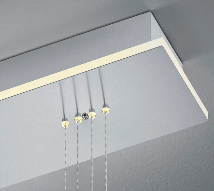 Das Deckengehäuse, die Seilzüge und die zylinderförmigen Gewichte der Pendellampe sind aus nickelfarbigem Metall gestaltet und haben gebürstete Oberflächen. Die nach unten geöffneten Lampenschirme sind aus satiniertem Opalglas hergestellt. Die energieeffizienten LED-Leuchtmittel sind fest in die Pendellampe eingebaut. Die Beleuchtung der Lampe ist mit einer Fernbedienung individuell steuerbar.